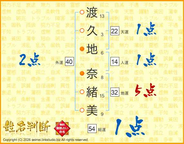 渡(13画)久(3画)地(6画) 奈(8画)緒(15画)美(9画)