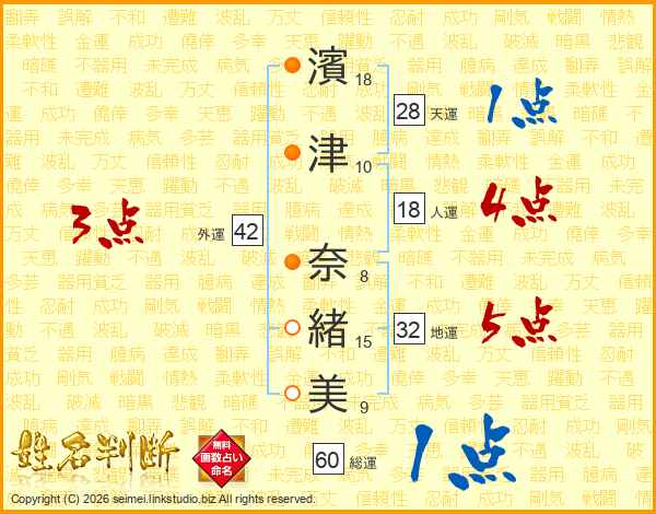 濱(18画)津(10画) 奈(8画)緒(15画)美(9画)
