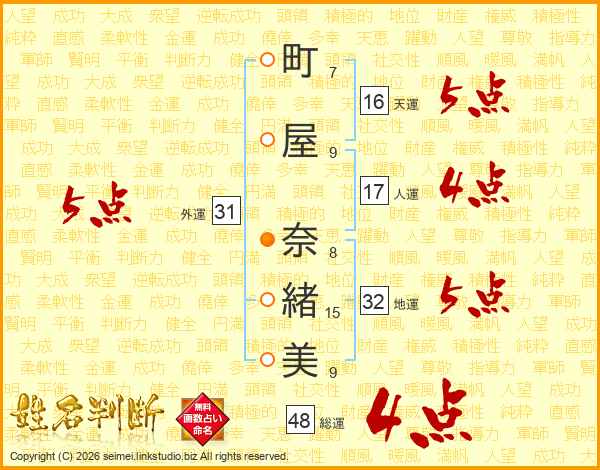 町(7画)屋(9画) 奈(8画)緒(15画)美(9画)
