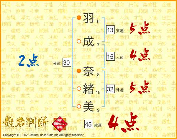 羽(6画)成(7画) 奈(8画)緒(15画)美(9画)