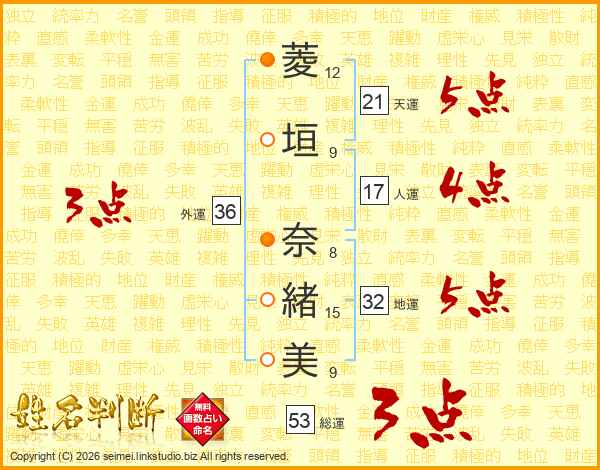 菱(12画)垣(9画) 奈(8画)緒(15画)美(9画)