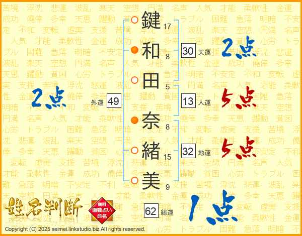 鍵(17画)和(8画)田(5画) 奈(8画)緒(15画)美(9画)