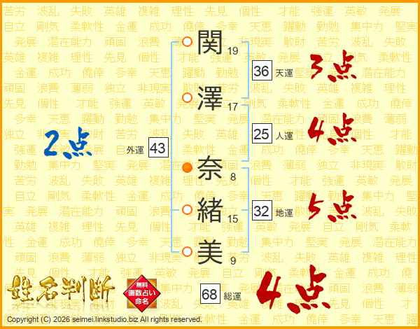 関(19画)澤(17画) 奈(8画)緒(15画)美(9画)