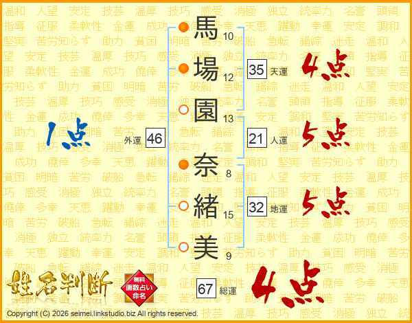 馬(10画)場(12画)園(13画) 奈(8画)緒(15画)美(9画)