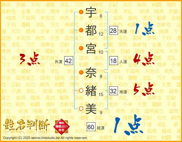 宇(6画)都(12画)宮(10画) 奈(8画)緒(15画)美(9画)