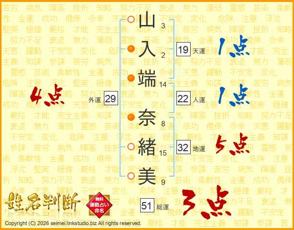 山(3画)入(2画)端(14画) 奈(8画)緒(15画)美(9画)