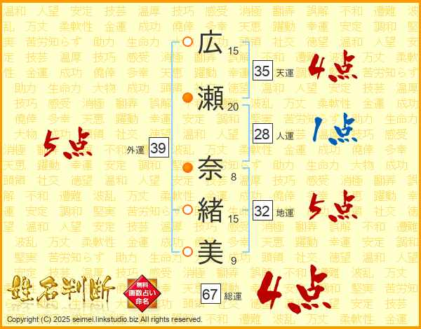 広(15画)瀬(20画) 奈(8画)緒(15画)美(9画)
