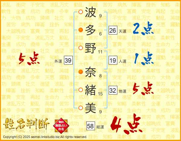 波(9画)多(6画)野(11画) 奈(8画)緒(15画)美(9画)