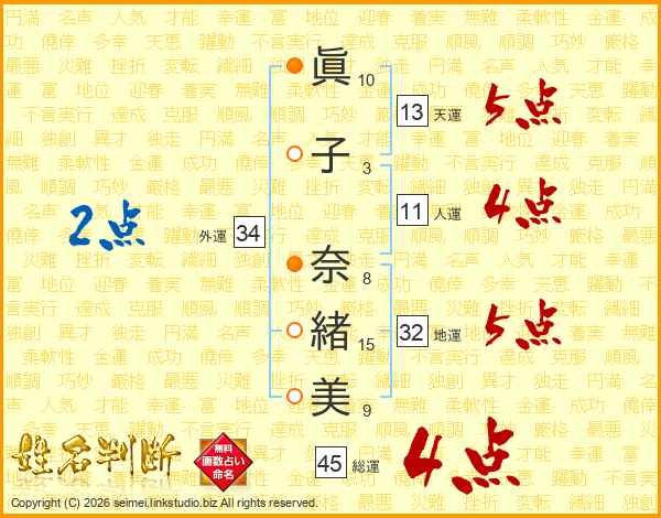 眞(10画)子(3画) 奈(8画)緒(15画)美(9画)