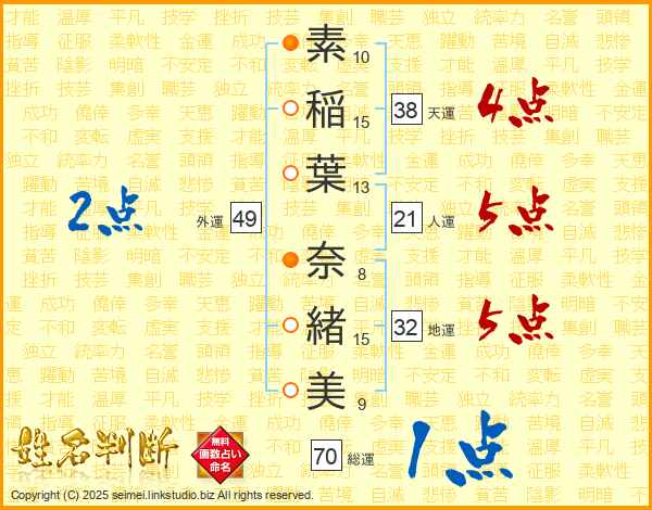 素稲葉奈緒美さんの外運は49画の2点!