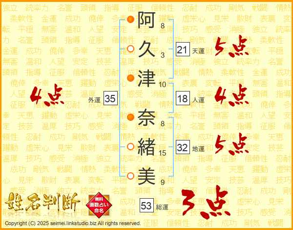 阿(8画)久(3画)津(10画) 奈(8画)緒(15画)美(9画)