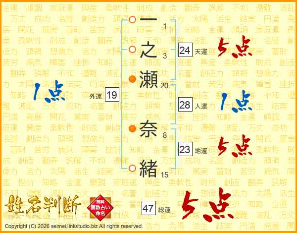 一(1画)之(3画)瀬(20画) 奈(8画)緒(15画)