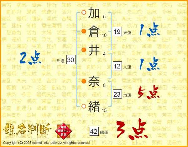 加(5画)倉(10画)井(4画) 奈(8画)緒(15画)