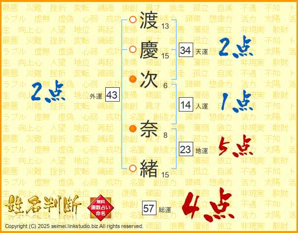 渡(13画)慶(15画)次(6画) 奈(8画)緒(15画)