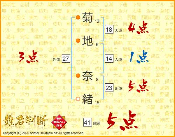 菊(12画)地(6画) 奈(8画)緒(15画)