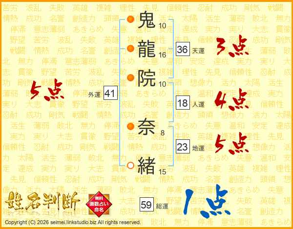 鬼(10画)龍(16画)院(10画) 奈(8画)緒(15画)