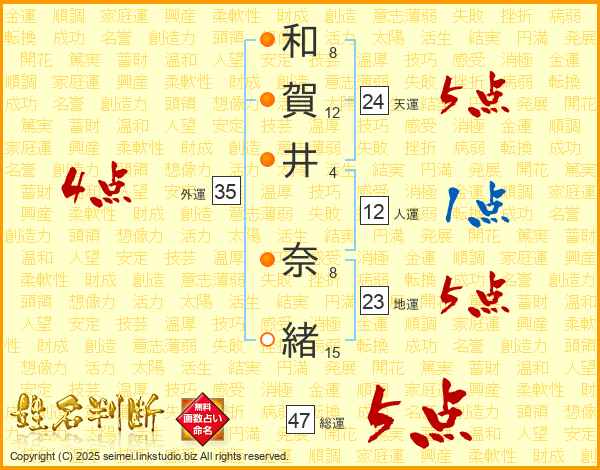 和(8画)賀(12画)井(4画) 奈(8画)緒(15画)