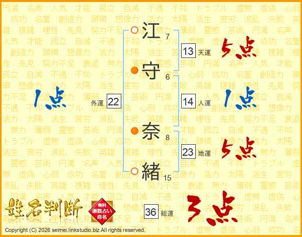 江(7画)守(6画) 奈(8画)緒(15画)