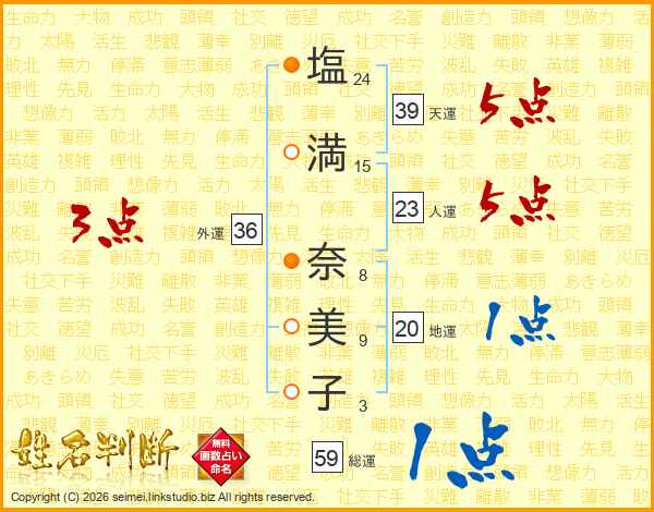 塩(24画)満(15画) 奈(8画)美(9画)子(3画)