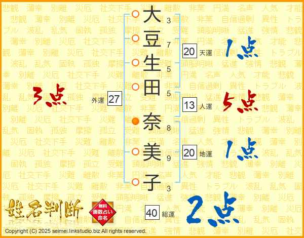 大(3画)豆(7画)生(5画)田(5画) 奈(8画)美(9画)子(3画)