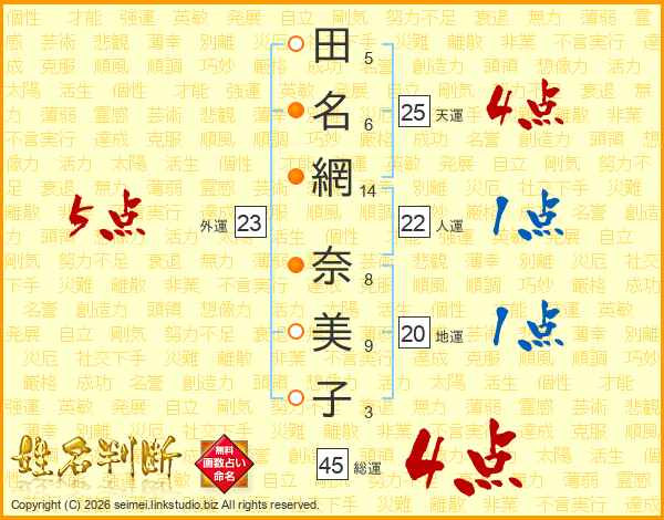 田(5画)名(6画)網(14画) 奈(8画)美(9画)子(3画)