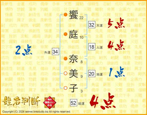 饗(22画)庭(10画) 奈(8画)美(9画)子(3画)