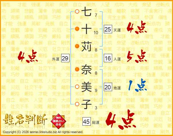 七十苅奈美子さんの総運は45画の4点!