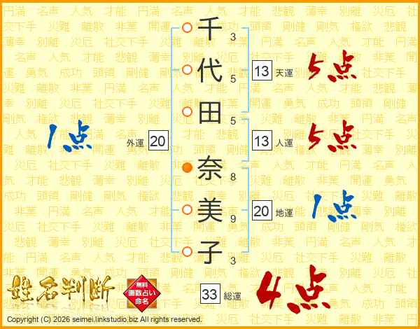 千(3画)代(5画)田(5画) 奈(8画)美(9画)子(3画)