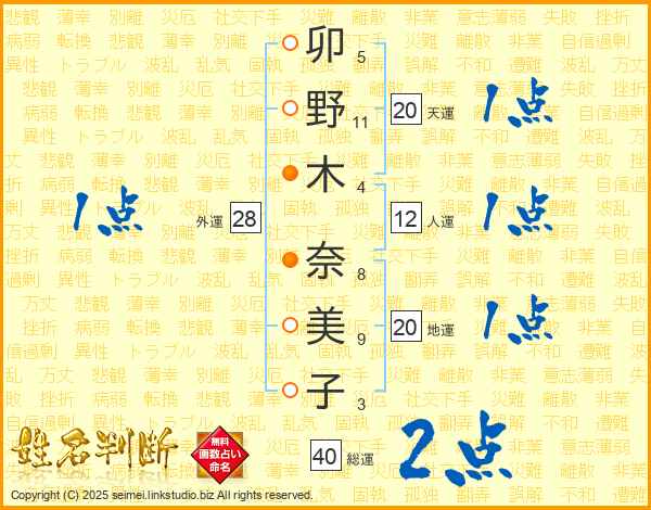 卯(5画)野(11画)木(4画) 奈(8画)美(9画)子(3画)