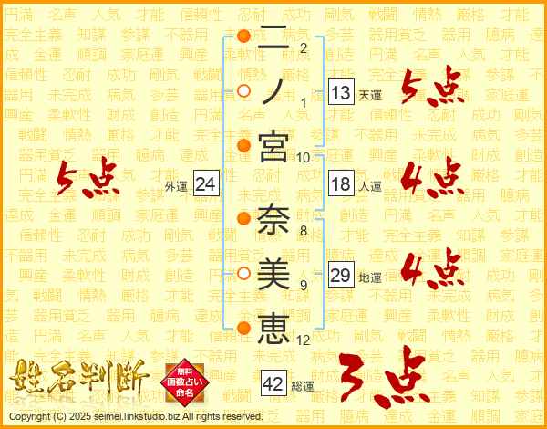 二(2画)ノ(1画)宮(10画) 奈(8画)美(9画)恵(12画)