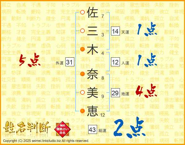 佐(7画)三(3画)木(4画) 奈(8画)美(9画)恵(12画)