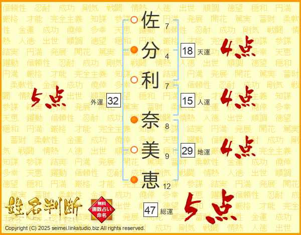 佐(7画)分(4画)利(7画) 奈(8画)美(9画)恵(12画)