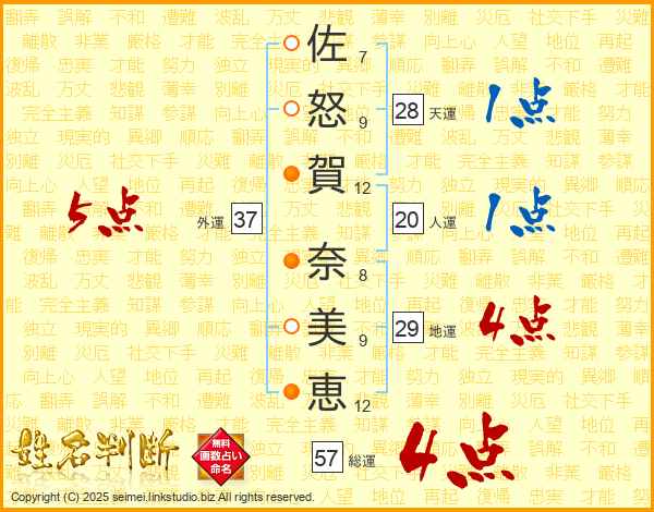 佐怒賀奈美恵さんの外運は37画の5点!