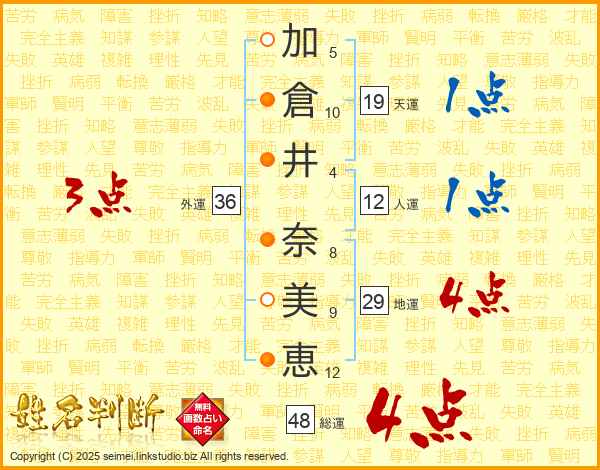 加(5画)倉(10画)井(4画) 奈(8画)美(9画)恵(12画)