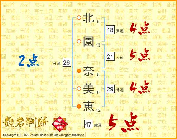 北(5画)園(13画) 奈(8画)美(9画)恵(12画)