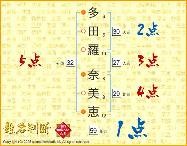 多(6画)田(5画)羅(19画) 奈(8画)美(9画)恵(12画)