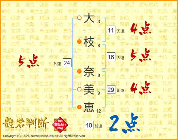 大(3画)枝(8画) 奈(8画)美(9画)恵(12画)