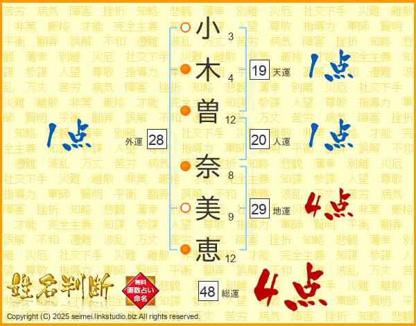 小(3画)木(4画)曽(12画) 奈(8画)美(9画)恵(12画)