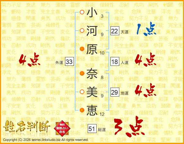 小(3画)河(9画)原(10画) 奈(8画)美(9画)恵(12画)