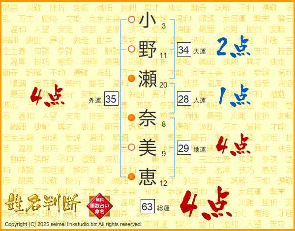 小(3画)野(11画)瀬(20画) 奈(8画)美(9画)恵(12画)