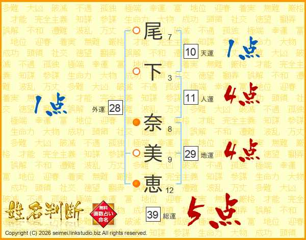 尾(7画)下(3画) 奈(8画)美(9画)恵(12画)