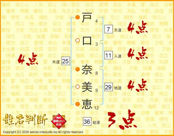 戸(4画)口(3画) 奈(8画)美(9画)恵(12画)