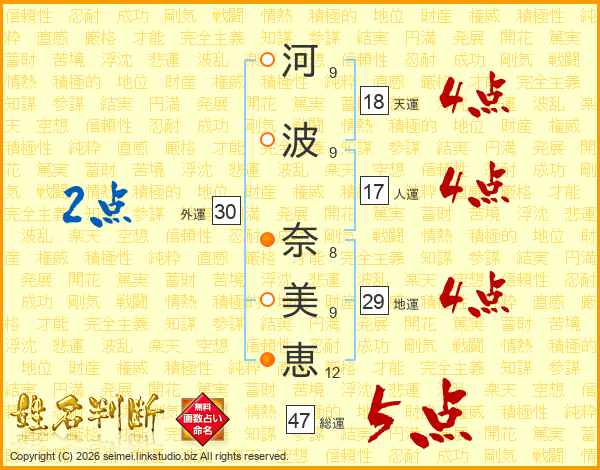 河(9画)波(9画) 奈(8画)美(9画)恵(12画)