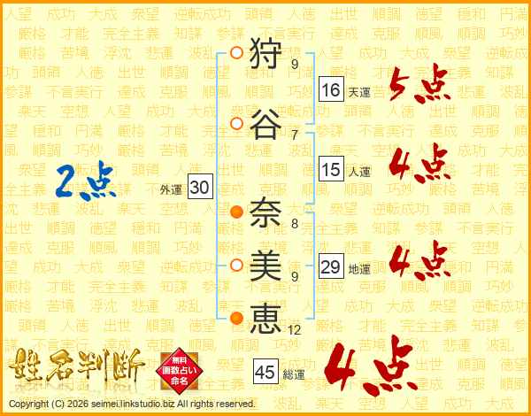 狩谷奈美恵さんの総運は45画の4点!