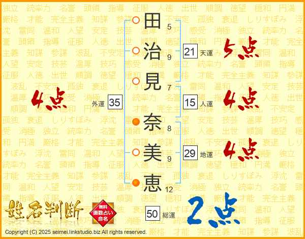 田(5画)治(9画)見(7画) 奈(8画)美(9画)恵(12画)