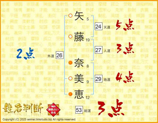 矢(5画)藤(19画) 奈(8画)美(9画)恵(12画)