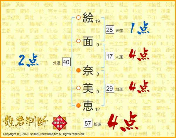 絵(19画)面(9画) 奈(8画)美(9画)恵(12画)