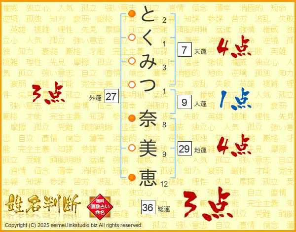 と(2画)く(1画)み(3画)つ(1画) 奈(8画)美(9画)恵(12画)