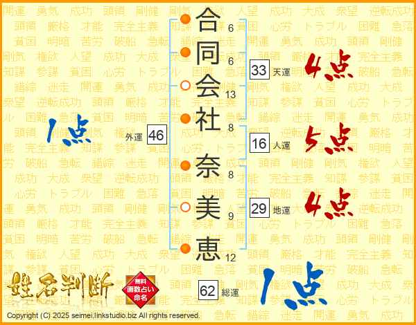 合(6画)同(6画)会(13画)社(8画) 奈(8画)美(9画)恵(12画)