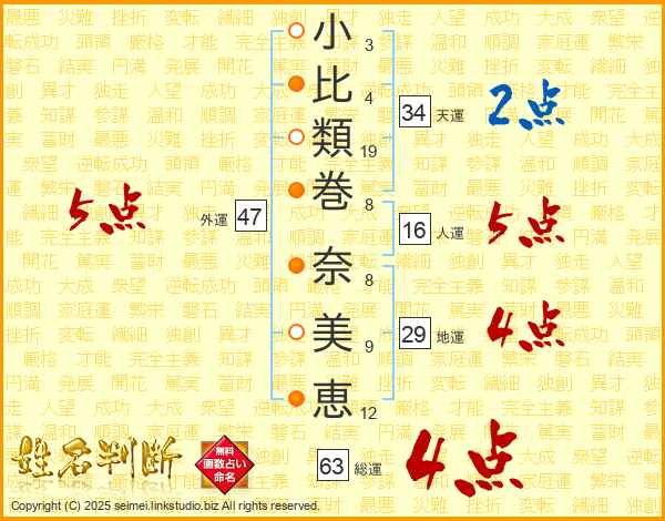 小(3画)比(4画)類(19画)巻(8画) 奈(8画)美(9画)恵(12画)